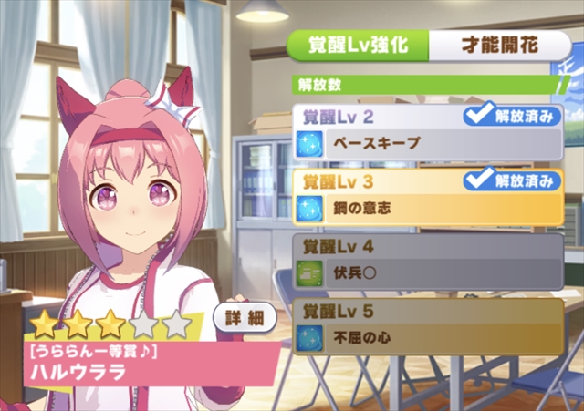 ハルウララのスキルはどちらも持久力回復スキル。バクシンオーと同じくスキル自体は悪くないのですが,シナリオが短距離~マイルであり,スタミナにそこまでの心配がないため,取得優先度は低くなっています。しかし,覚醒レベル4で覚える「伏兵〇」も含めて,有馬記念で使いたくなるようなスキルが多いのはわざとなんでしょうかね。