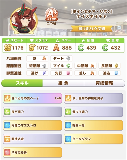 しかしそれであれば,逃げウマ娘や先行ウマ娘を採用すればいいじゃないと思いますが,自分が育成したセイウンスカイはかなり自信があったものの,初日の成績は20戦1勝とまったく奮いませんでした。周りの話を聞いてもほとんどがゴールドシップorナリタタイシンが活躍しているようで,そもそも逃げウマ娘と先行ウマ娘が勝ちにくいレース条件になっているのだと自分は考えています。