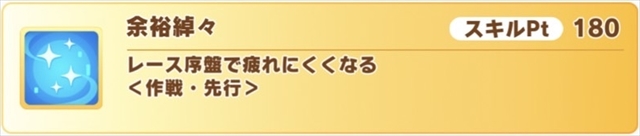 育成の場合,最近は逃げ運用することが多いので,発動しなければそのまま勝ち,発動すれば粘れるので感触は悪くない感じ。チャンミのようなガチレースの場合は,差しより後ろの脚質に詰められている時点でかなりやばいので評価はそこそこに落ち着きそうです。