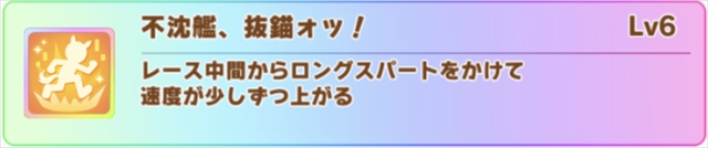ポジションキープ区間を常にマイナス補正で走るため,ふだんよりも体力消費が減ります。どれくらい減るかは厳密にはわかりませんが,およそ金回復1~2個分とのことで,先ほど挙げた「眠れる獅子」が発動しなくてもお釣りが出るくらいには消費体力が減少するようです。