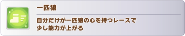 わかりやすすぎますね。中長距離で使うウマ娘に「一匹狼」を覚えさせるメリットはまったくありません。逆にダート,短距離,マイルは1人だけに覚えさせれば,対戦相手が覚えていなければ確定で発動します。相手に発動させない意味も込めて,1人だけに覚えさせるのは有効な気がしています。